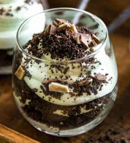 A minty and creamy parfait, prepared with fresh chocolate pudding, whipped cream that has been flavoured with fresh mint, and grounds of chocolate all across the top.