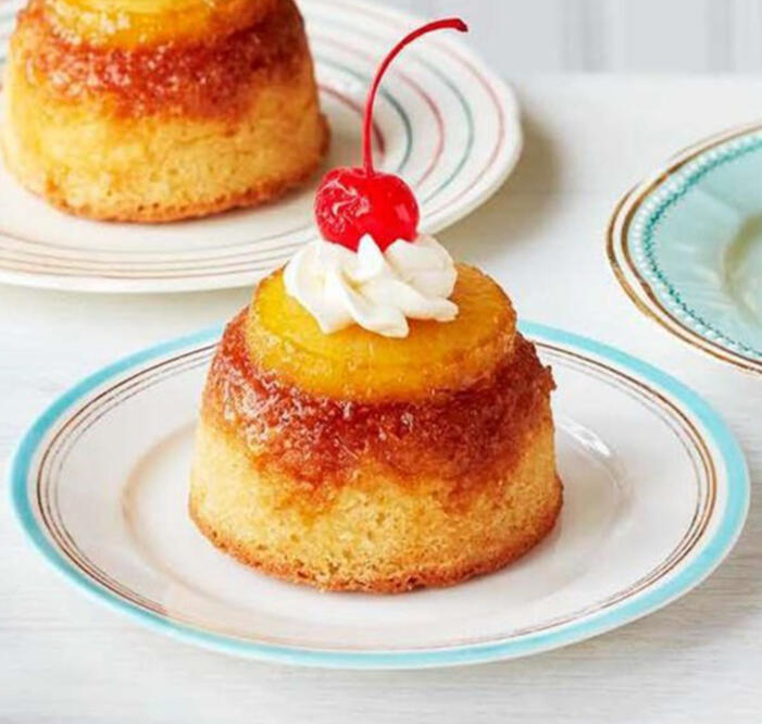 A delicate mound of spongey soft cake, topped with a caramelised circlet of pineapple, then adorned with a puff of whipped cream and a small cherry.