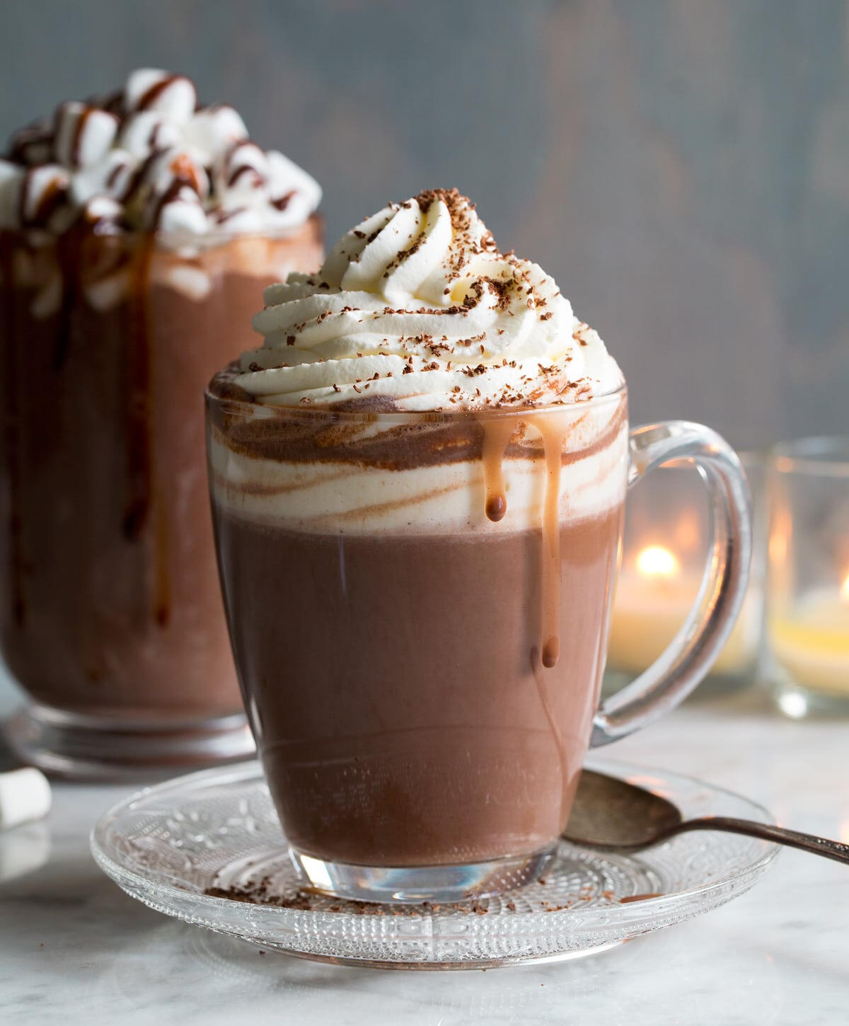 Topped with a generous amount of whipped cream, and chocolate shavings.